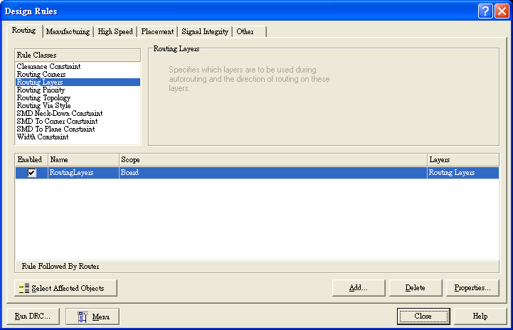 因列舉電路不是很複雜關(guān)系,所以我們用單面版就可以布線完成,而通常PROTEL里預(yù)設(shè)版面是以雙面來進(jìn)行布線,所以我們要選擇成單面布線。選擇上方主目錄中Design→Rules出現(xiàn)對話框后,選到Routing Layers后,進(jìn)入右下角的設(shè)定Properties,如圖18。